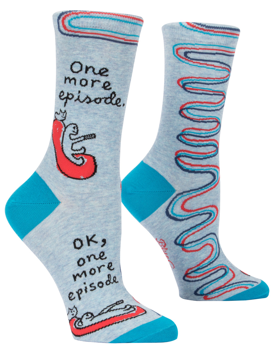 Introducing the Blue Q One More Episode Women's Crew Sock - the perfect addition to your cozy sock collection! With its high-quality materials and comfortable fit, these socks will keep your feet warm and stylish. The playful "One More Episode" design adds a touch of personality, making these socks a must-have for any TV binge watcher.