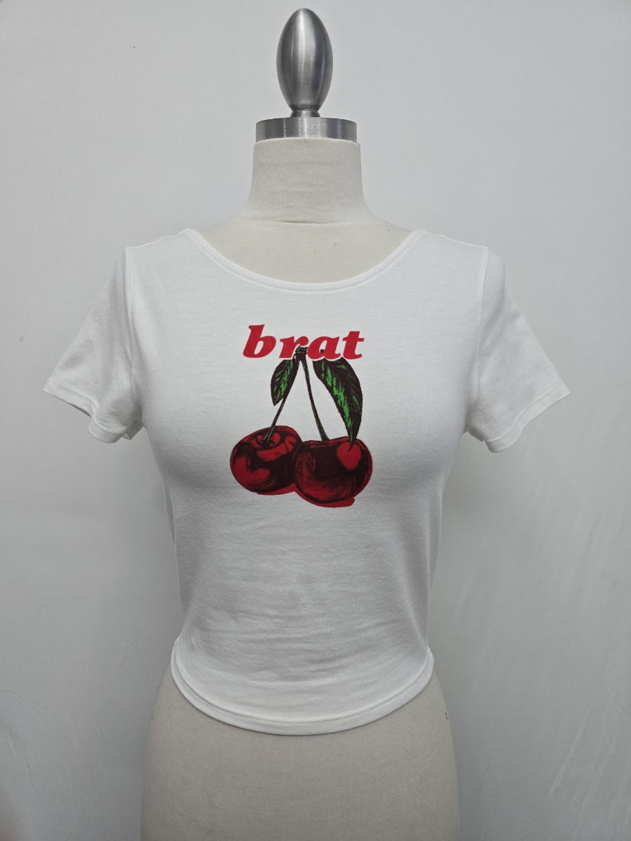Indulge in the sweet cherry design of our G Mini Brat Cherry Cotton Tee. Made with high-quality cotton, this tee offers ultimate comfort and style. Perfect for adding a playful touch to any outfit, this tee is a must-have for any fashion-forward individual. Get yours now and stand out from the crowd!