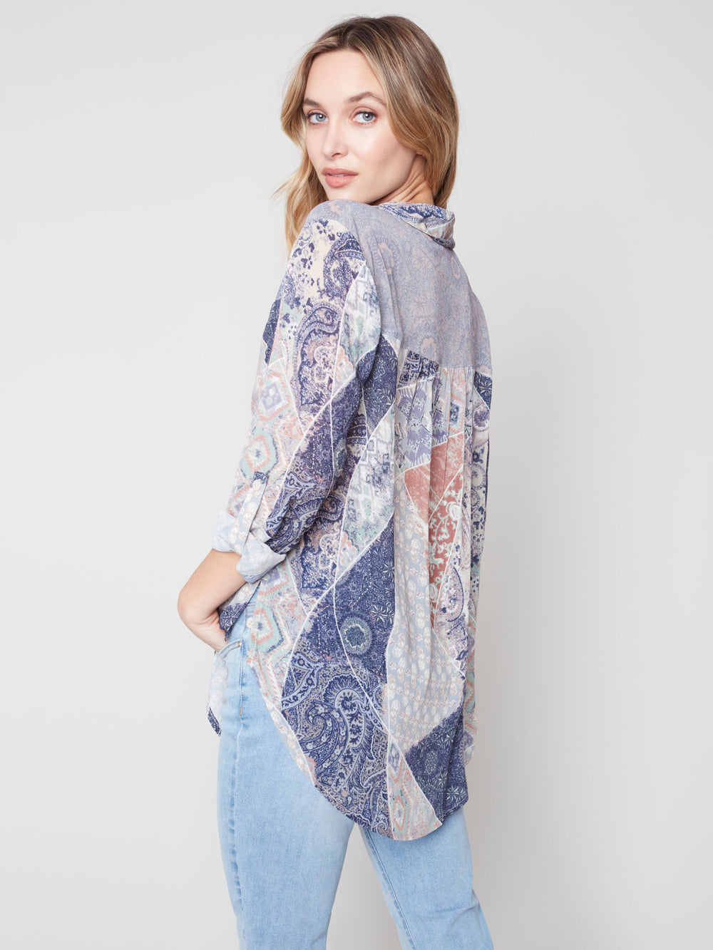 This Charlie B wear-2 ways printed combo crepe blouse in the color marine is the perfect way to add some color to your spring wardrobe!