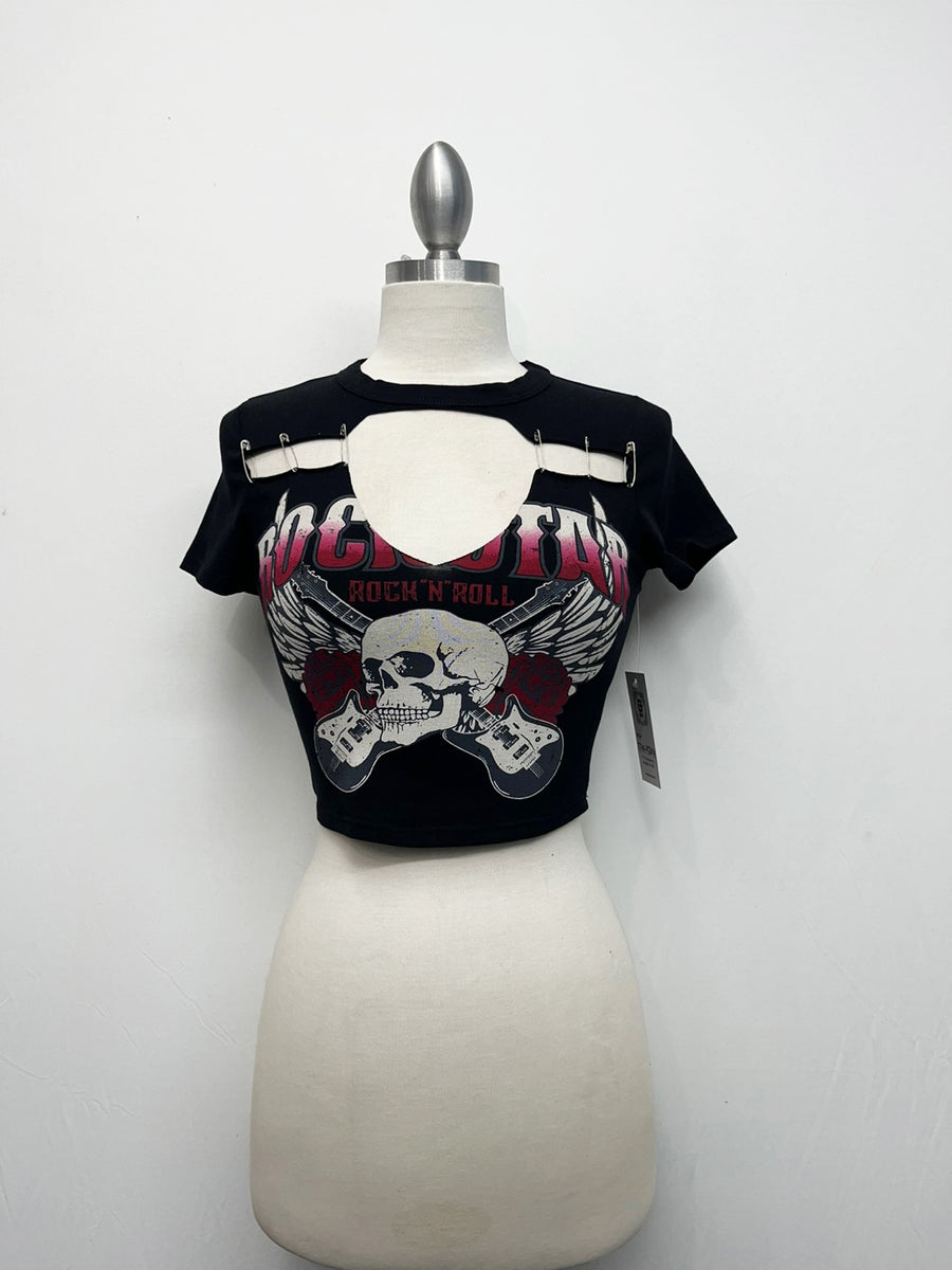 Elevate your style game with the G Mini Rock & Roll Skull Head Pins Cotton Top. Made with soft cotton, this top is adorned with edgy skull head pins for a rock & roll touch. Perfect for adding a bold statement to any outfit.