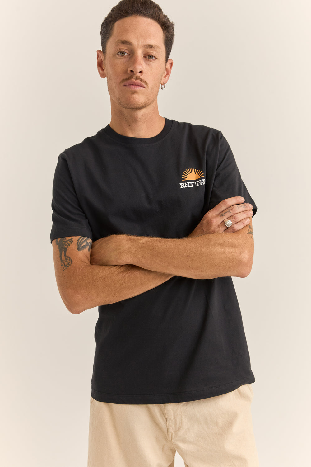 The Rhythm Awake Tee in Black is made with 100% cotton and features arib k nit neck band for comfort. The screen print artwork and Rhythm trims add a touch of attitude, making it the perfect statement piece.