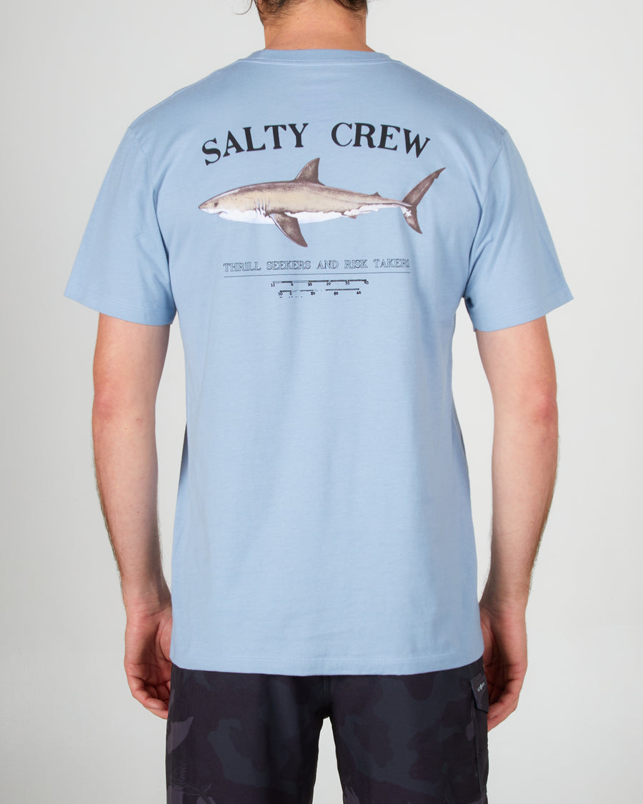 The Salty Crew Bruce Premium S/S Tee comes in marine blue and features the Salty Crew logo on the back along with a print of a fish.