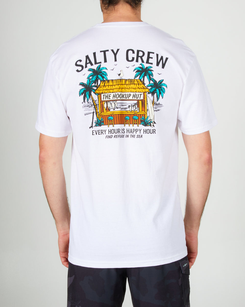 The Salty Crew Salty Hut Standard S/S Tee features the Salty Crew logo small on the front and in a larger, different design on the back. The one on the back is in color.