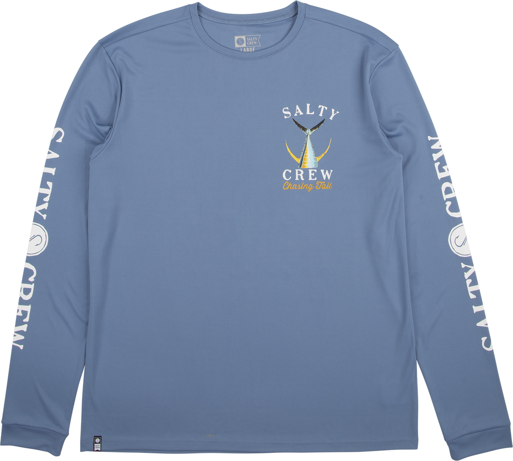 The Salty Crew Tailed L/S Sunshirt comes in either charcoal or marine blue and features the Salty Crew logo on the front and back. The front logo is small while the back logo is larger. Salty Crew is also printed on the sleeves.