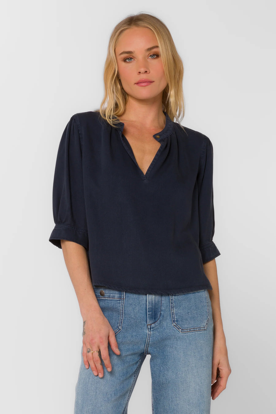 This playful short puff sleeve top in vibrant Patriot Blue is made from a soft, eco-friendly blend of LENZING™ ECOVERO™ viscose and TENCEL™ lyocell. Its lightweight, breathable fabric drapes beautifully, offering a buttery touch that feels as good as it looks. Featuring a mandarin collar, split neckline, and elbow-length sleeves with buttoned cuffs, it effortlessly pops over your head for easy wear and a flirty finish. Perfect for adding a fun, fresh vibe to any outfit!