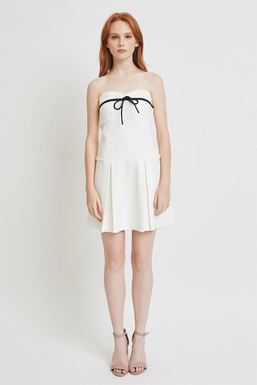 Expertly crafted from high-quality materials, the Lena Contrasting Bow Detail Mini Dress is a must-have addition to your wardrobe. The delicate bow detailing adds a feminine touch, while the contrasting colors create a modern and chic look. Perfect for any occasion, this dress is sure to make a statement and elevate your style.
