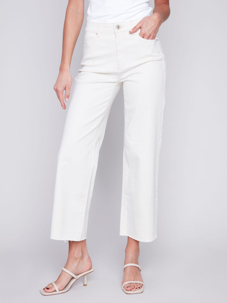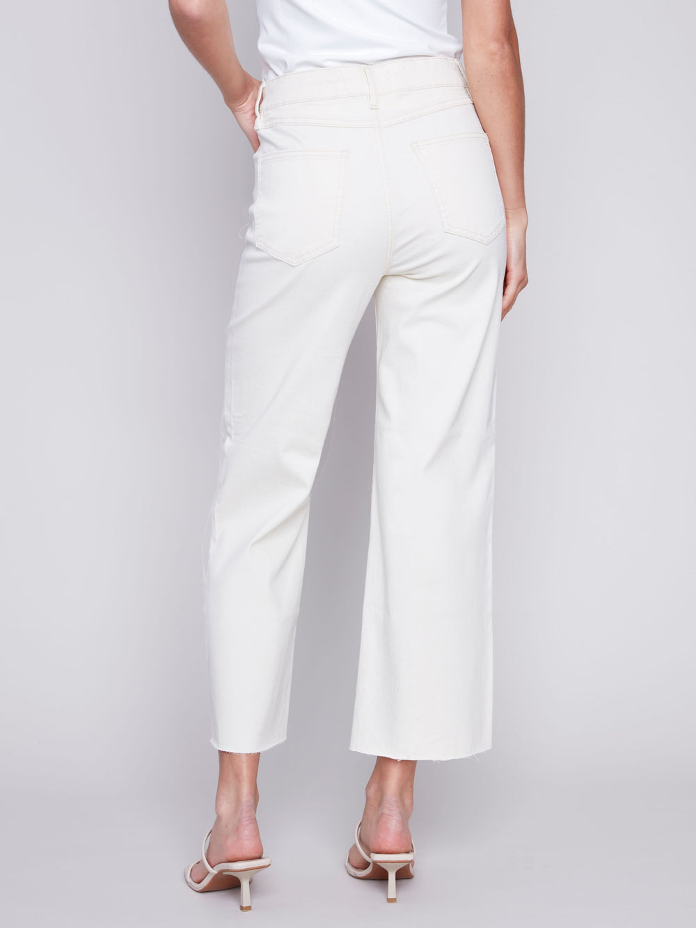 Introducing the Charlie B Natural Flex Wide Leg Raw Edge Pant - a must-have for any fashion-forward individual. Crafted with the highest quality materials, these pants offer unparalleled comfort and flexibility for all-day wear. The wide leg design and raw edge finish add a touch of effortless style to any outfit. Elevate your wardrobe with these versatile and chic pants.