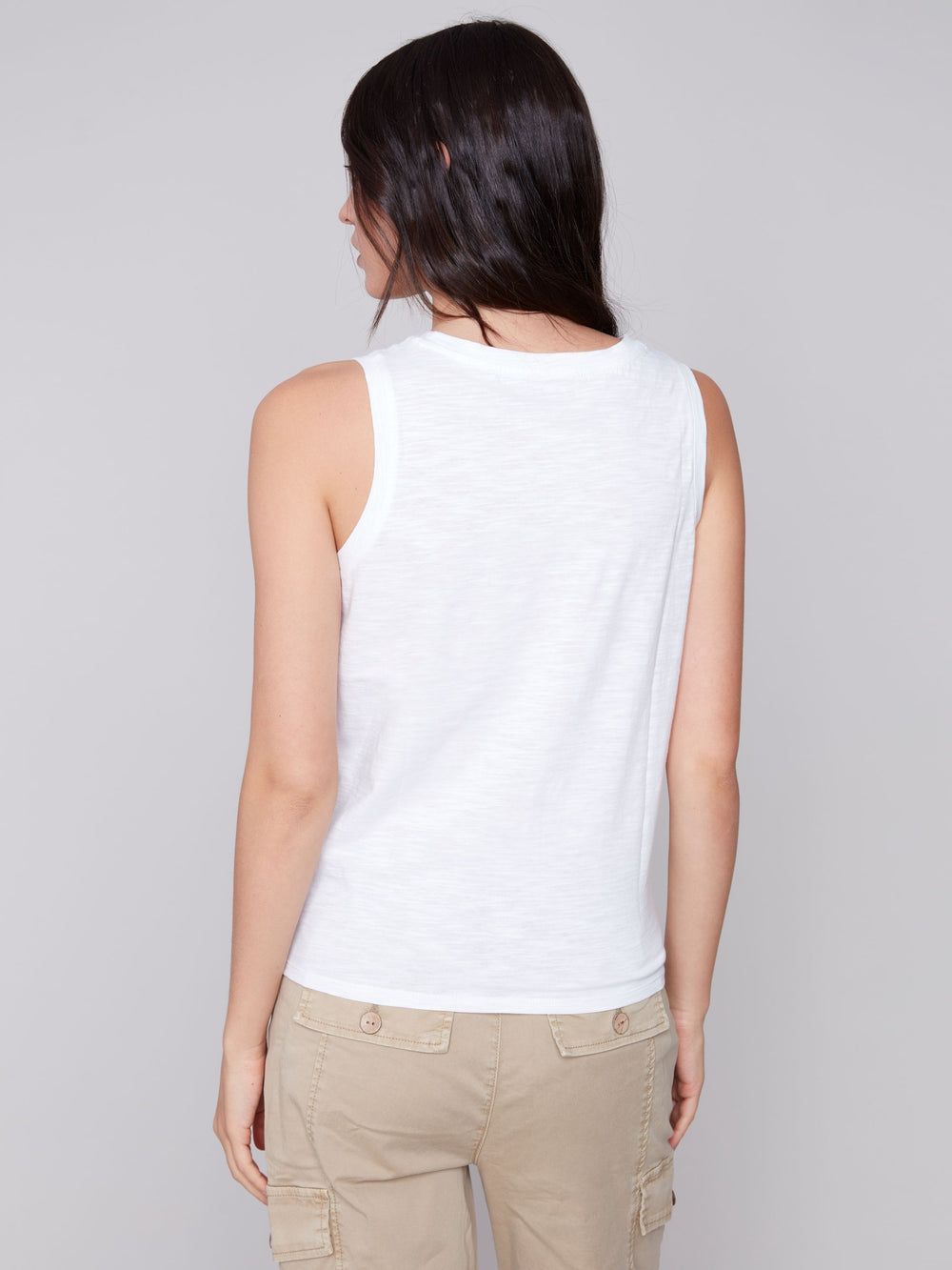 Expertly crafted by Charlie B, this Sleeveless Tank Top features a unique twisted hem at the front, adding a touch of elegance to a classic design. Made with high-quality materials, this tank top offers comfort and style in one. Perfect for any occasion, elevate your wardrobe with this must-have piece.
