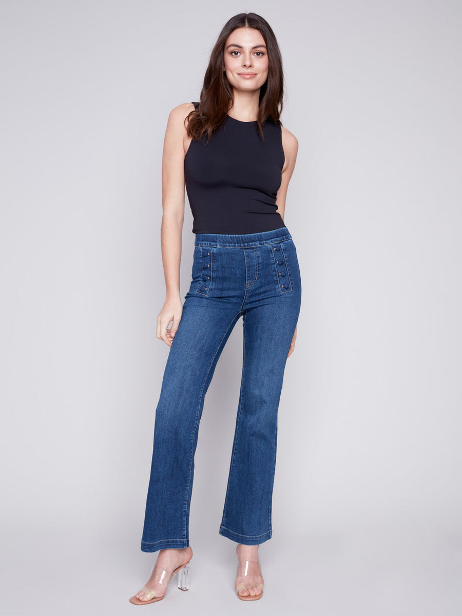 Introducing our Charlie B Wide Leg Pant With Front Button Plackets. Made with a wide leg design and convenient front button plackets, these pants are both fashionable and functional. Expertly crafted for ultimate comfort and style. Elevate your wardrobe with this must-have piece.