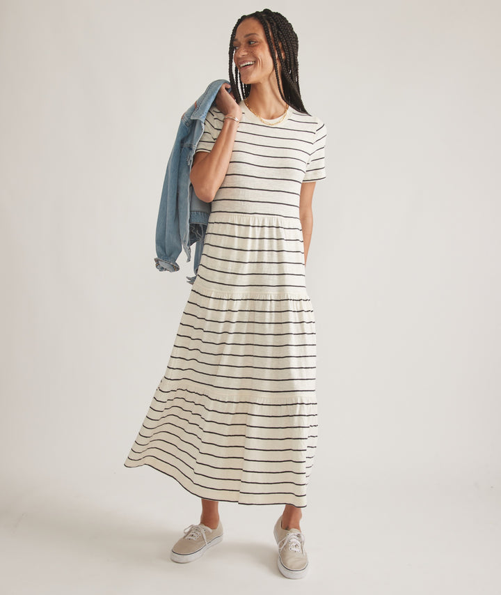 This Marine Layer Vintage Slub Midi Dress is made from high-quality fabrics to provide a comfortable and stylish fit. Its vintage slub design adds a touch of sophistication, making it perfect for any occasion. With a flattering midi length, it'll become your go-to dress for effortless, timeless style.