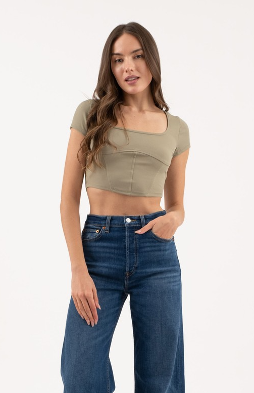 Elevate your style with this Mine Corset Detail Short Sleeve Knit Crop Top. Featuring a flattering scoop neckline and chic corset detailing, this lightweight, solid-colored knit top offers a comfortable, breathable fit. Its cropped length and short sleeves make it perfect for layering or wearing solo on warmer days. Unlined for a natural feel, this versatile piece effortlessly combines fashion and comfort.