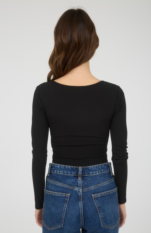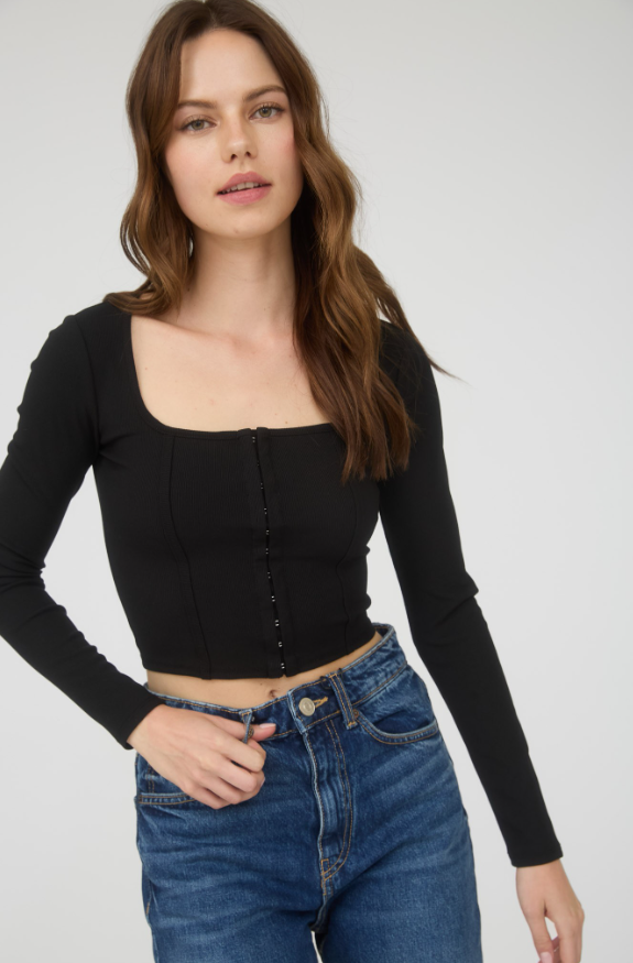 Elevate your style with the Mine Front Hook Long Sleeve Knit Crop Top. Featuring a flattering scoop neckline and long sleeves, this cropped top offers a chic silhouette enhanced by corset detailing. The front hook and eye closure adds a touch of edgy sophistication, while the solid color ensures versatile pairing options. Crafted without lining for a lightweight, comfortable fit, it’s perfect for layering or wearing on its own to make a bold statement.
