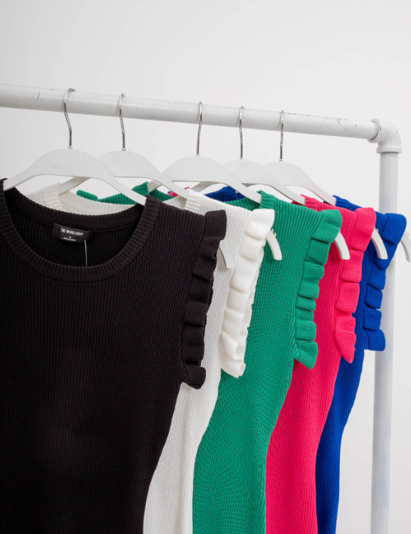 Elevate your wardrobe with this fitted sleeveless knit top featuring a flattering round neckline and elegant ruffle shoulder details. Its solid color and sleek design make it a versatile piece that effortlessly transitions from day to night. Experience comfort and style combined in one must-have sweater.