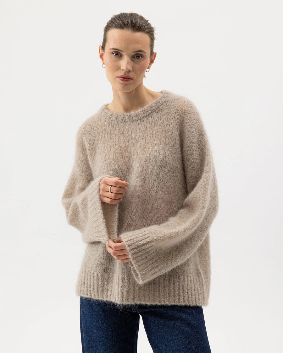 Experience the luxurious softness of this knitted sweater crafted from a lightweight, airy mohair blend. Designed with an oversized fit, round neck, and dropped shoulders, it offers effortless style and comfort. Made with RMS-certified mohair, it guarantees animal welfare, sustainable pasture use, and ethical production. Proudly and sustainably produced in Europe, this sweater combines conscious fashion with lasting quality.