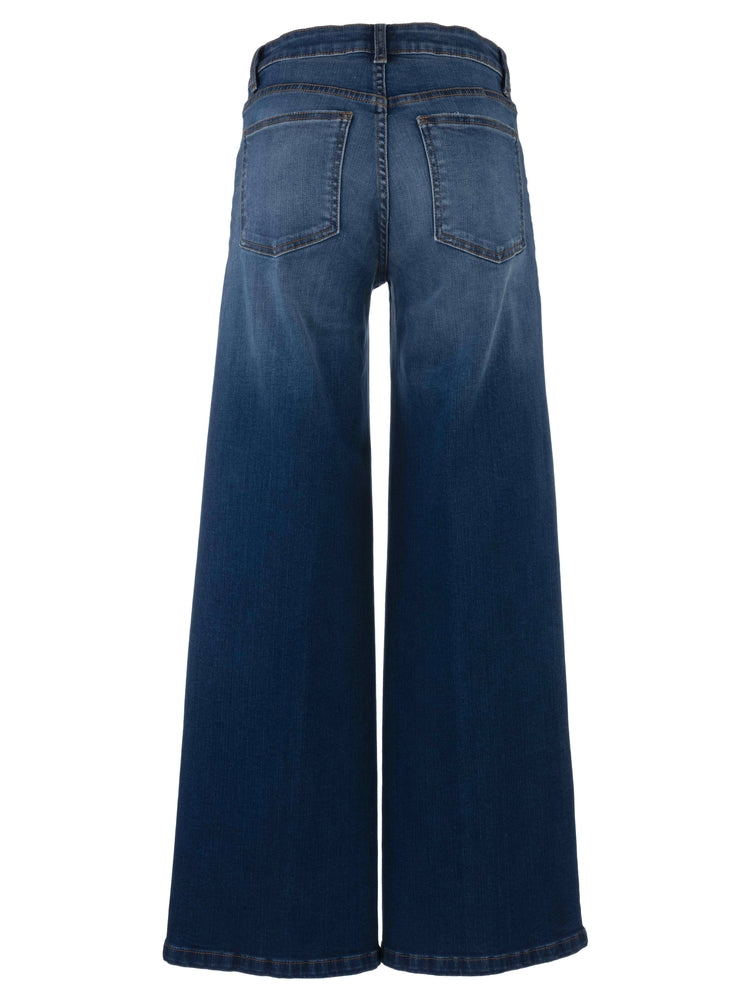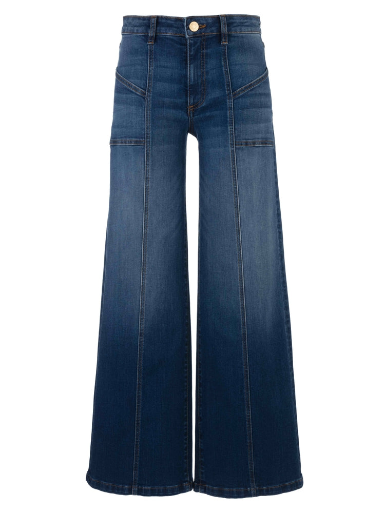 These Kut High Rise Wide Front Seam Patch Front Pocket Jeans offer a sophisticated silhouette with a wide-leg fit, featuring a 31.5" inseam and a 22" leg opening. Crafted from a comfortable blend of 96% cotton, 3% polyester, and 1% spandex denim, they provide subtle stretch and durability. The 10" rise enhances the high-waisted design, while the distinctive front seam and patch pockets add refined detail to elevate your wardrobe.