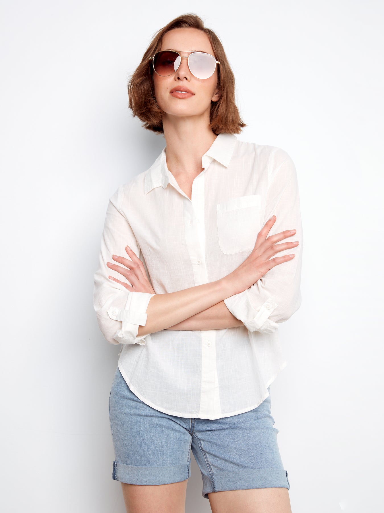 Elevate your everyday wardrobe with this versatile Charlie B cotton button-up shirt! Featuring charming rolled-up sleeves that add a casual, effortless touch, this piece transitions seamlessly from office to weekend. Crafted from soft, breathable cotton, it's designed for all-day comfort and easy care. Perfect for layering or wearing solo, this timeless blouse pairs beautifully with jeans, skirts, or trousers. A wardrobe essential that keeps you looking polished and put-together, no matter where your day takes you!