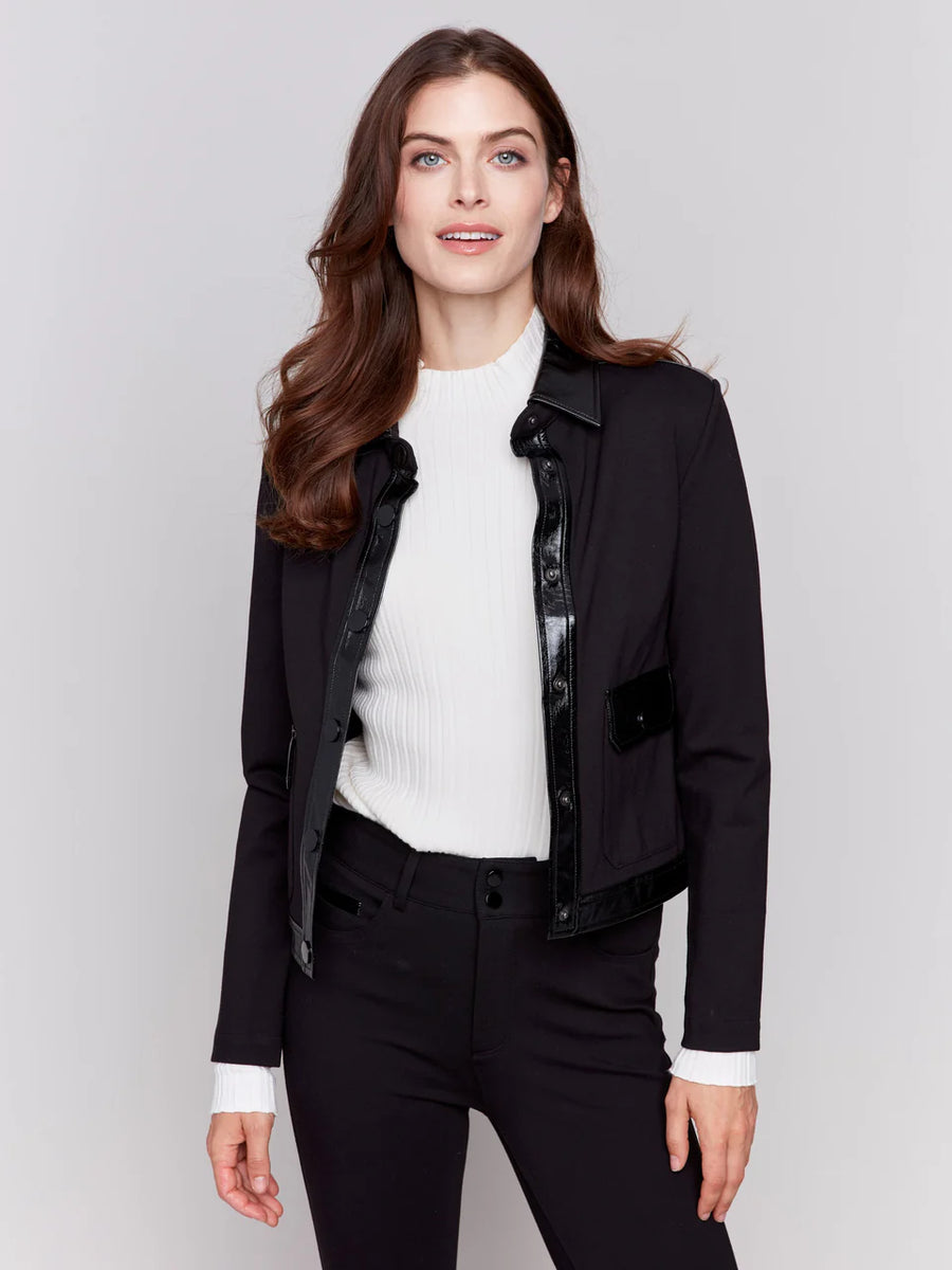 Add a touch of edginess to your outfit with Charlie B's Short Ponte Knit Jacket! Featuring a snap button closure and glossy vinyl-trimmed details, this jacket is both functional and stylish. Plus, with convenient front flap pockets, you'll have everything you need right at your fingertips.