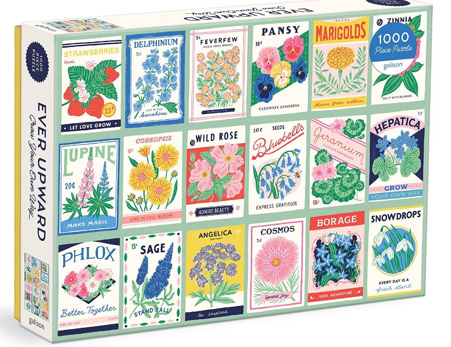 The Ever Upward Grow Your Own Way 1000 Piece Puzzle draws inspiration from vintage packaging for both a challenging as well as joyous puzzle experience.