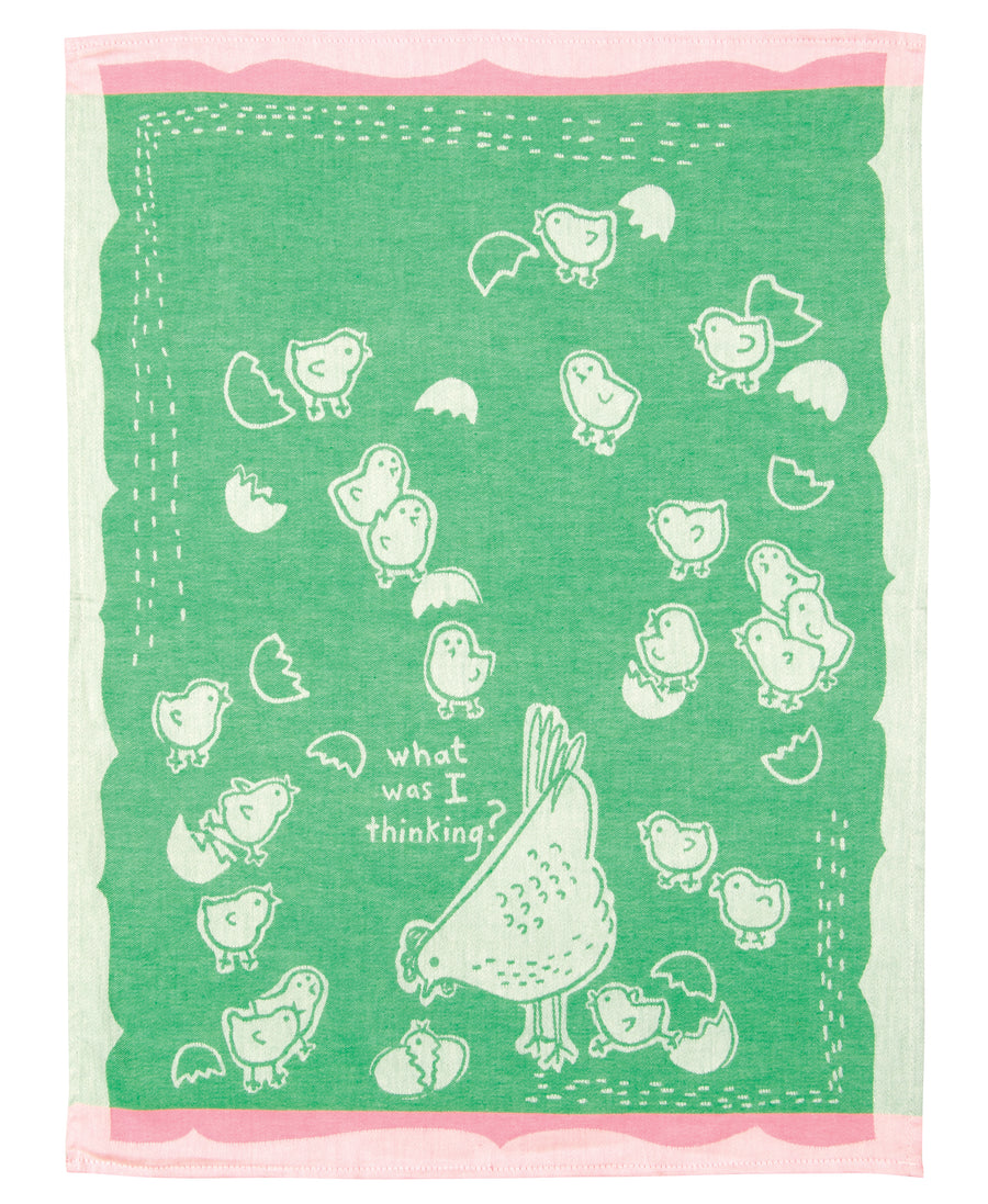 "Expertly crafted from durable and absorbent cotton, the Blue Q What Was I Thinking Dish Towel is perfect for tackling tough kitchen messes. Designed with a playful and humorous print, it adds a touch of personality to your daily cleaning routine. Machine washable and long-lasting, it's a must-have for any kitchen."