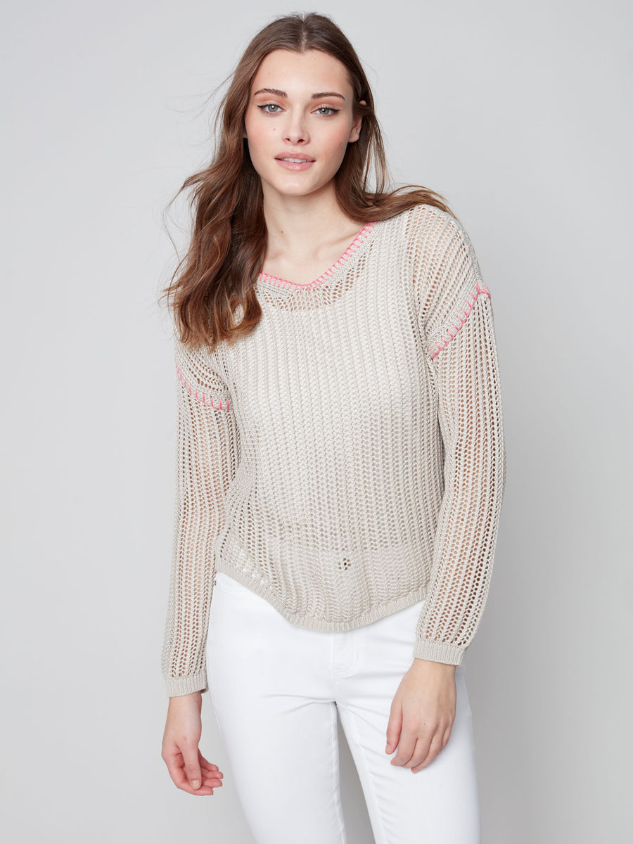 This Charlie B long-sleeve V-neck solid fishnet sweater in the color greige is the perfect way to add some spunk to your wardrobe!