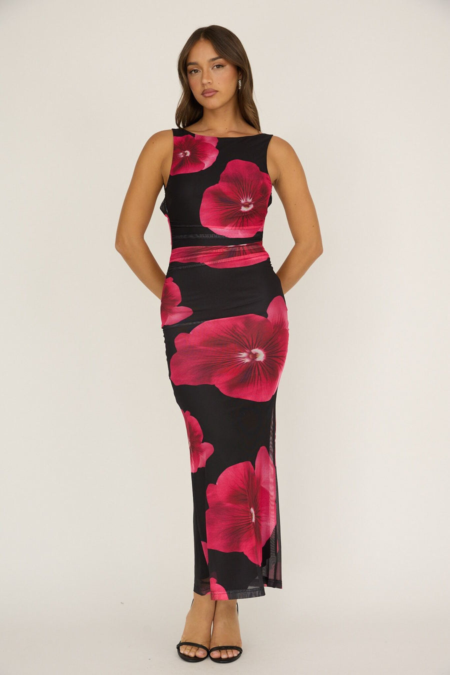 Spring Haze Big Flower Print Mesh Maxi Dress
