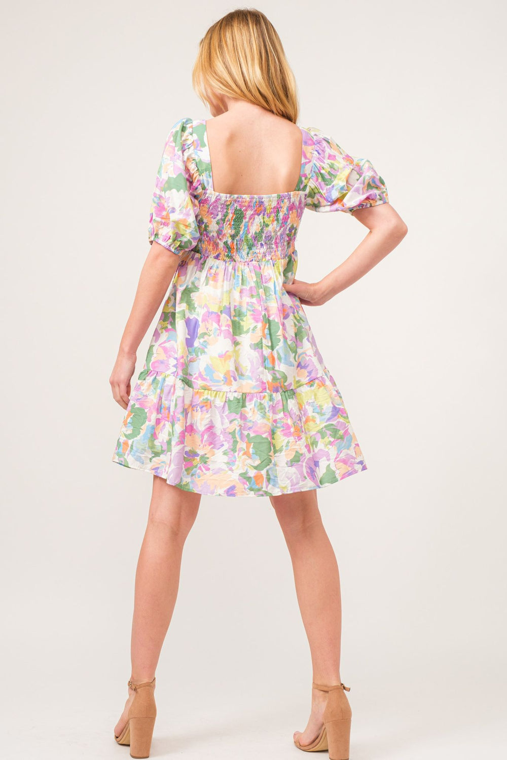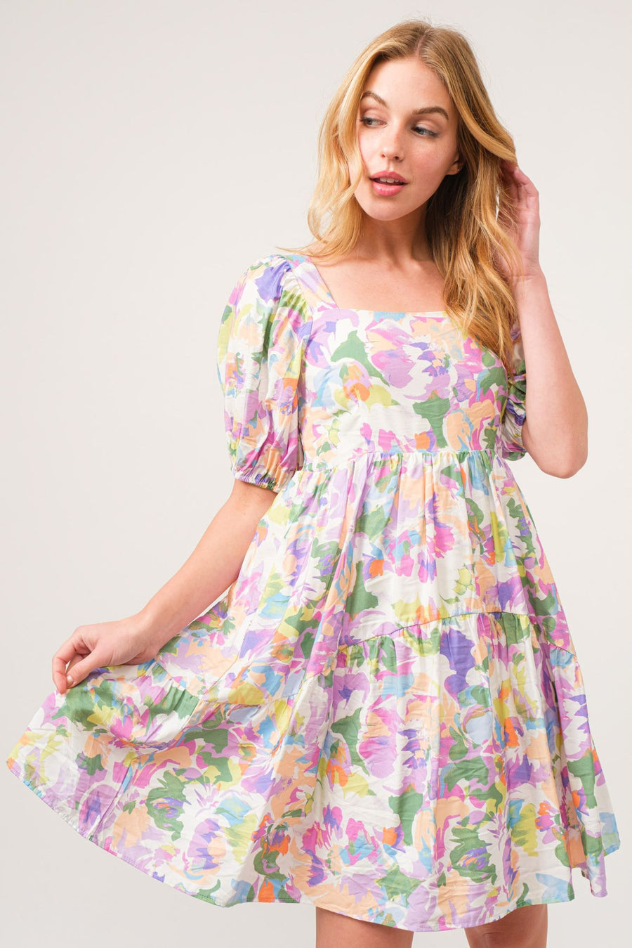 Andthewhy Square Neck Puff Sleeve Tiered Floral Dress