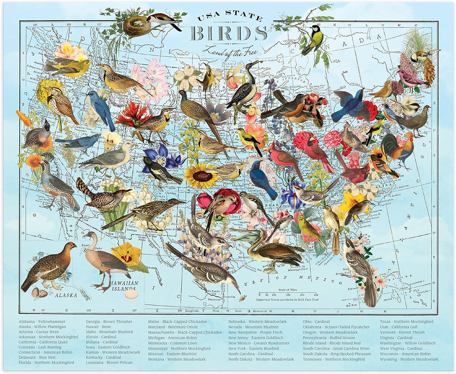 This exquisite 1000 piece puzzle features colorful state birds illustrated by renowned artist Wendy Gold. Crafted by Galison, this puzzle showcases state birds from all over the country, perfect for bird enthusiasts and puzzle lovers alike. Assemble and admire this beautiful puzzle alone or with friends and family, making it a perfect addition to any puzzle collection.