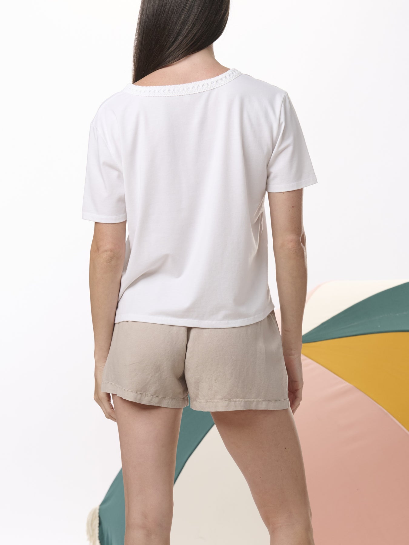 Introducing our Splendid Kacey tee, the perfect blend of boho and comfort. With crochet detailing around the v-neck, this boxy relaxed tshirt is sure to make a statement. Made with a slight stretch, you can enjoy all day comfort in style.