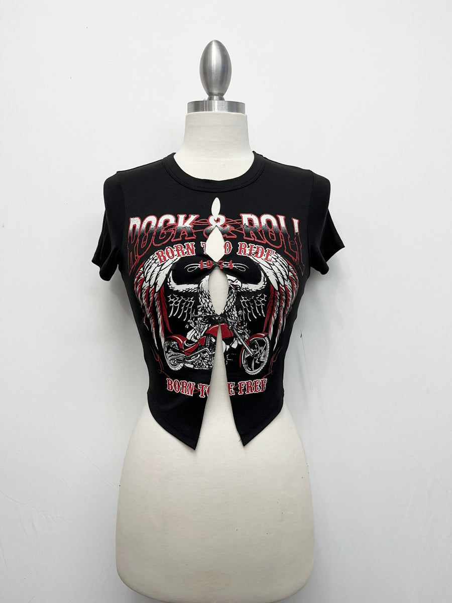 Introducing the G Mini Rock & Roll Eagle Laser Cut Top. Made with precision laser cutting technology, this top features a unique eagle design for a bold and edgy look. Crafted with high-quality materials, it offers both style and comfort. Elevate your wardrobe with this expertly crafted top.