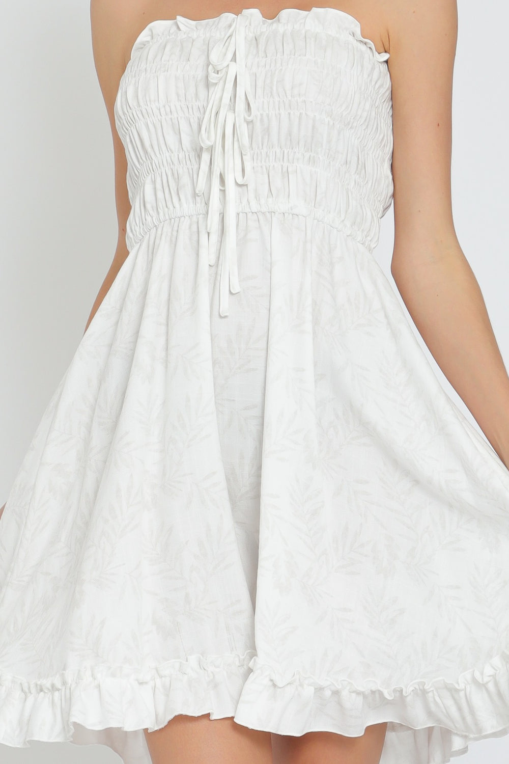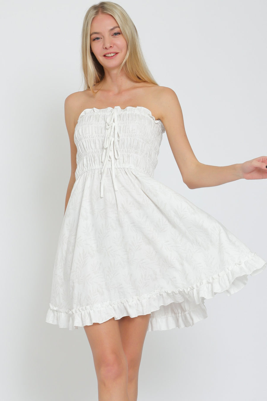 Embrace your style with the Aakaa Tube Tie Top And Ruffle Hem Mini Dress! This dress features a trendy tube top design with a tie detail, adding a touch of elegance. The ruffled hem finishes off the look, creating a flirty and fun ensemble. Perfect for any summer occasion, this dress will elevate your fashion game!