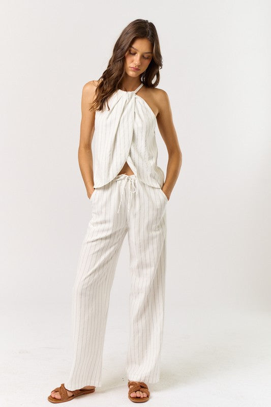 Elevate your style with our Blue Blush Stripe Halter & Drawstring Pant Set. This set includes a matching Black and Off White striped halter top and drawstring elastic waistband pants for a put-together look. Feel confident and stylish in this comfortable and chic ensemble.