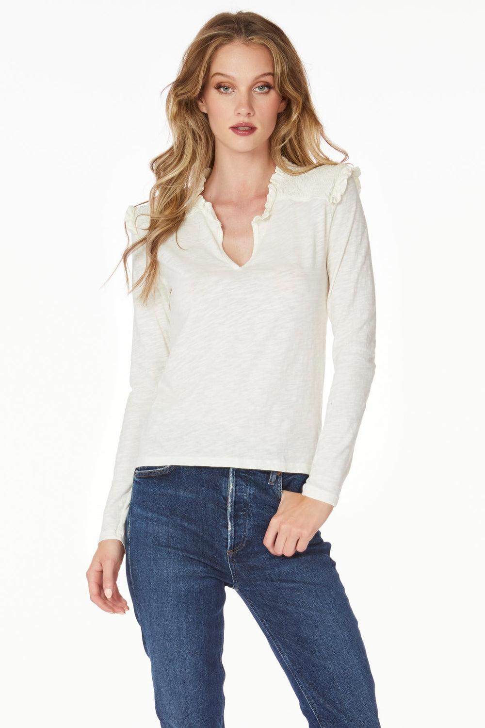 Das Bobi Smocked Yoke Ruffle Top ist eine raffinierte Wahl für jeden Tag der Woche. Die gesmokte Passe und die Rüschendetails bestehen aus einer leichten Leinen-Baumwoll-Mischung und verleihen jedem Outfit einzigartigen Stil und Struktur. Dieses atmungsaktive und bequeme Oberteil wird mit Sicherheit zu einem festen Bestandteil Ihrer Garderobe.