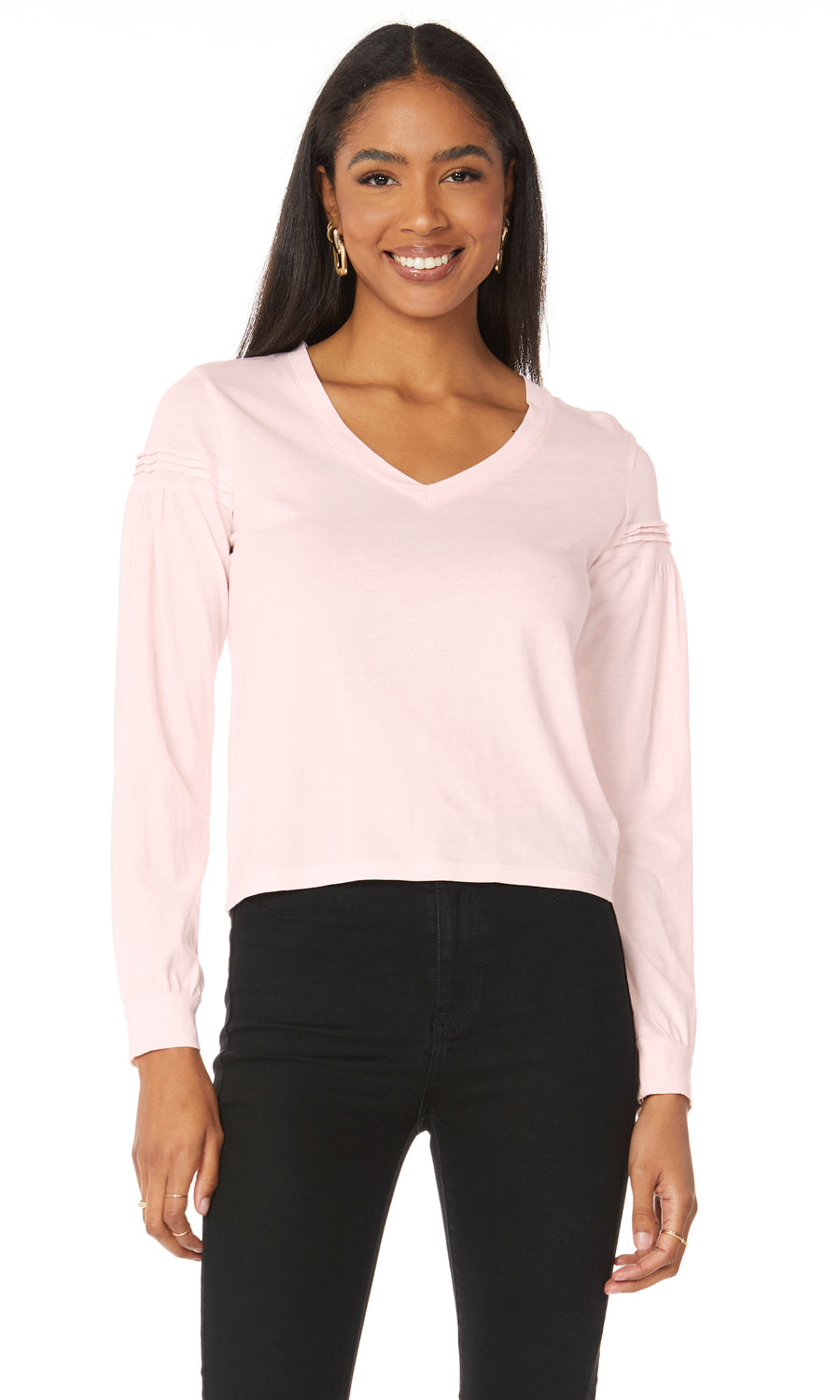 Take your t-shirt game to the next level with Bobi's V-Neck Pintuck Detail L/S Tee. This unique top features pintuck detailing, giving it a chic touch. The soft and comfortable material makes it perfect for everyday wear. Upgrade your wardrobe with this must-have tee!