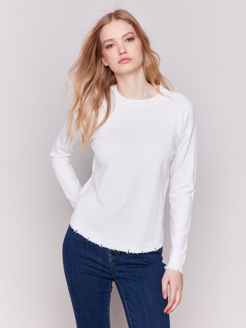 The Charlie B Frayed Edge Round Hem Sweater offers a casual, laid-back look with its frayed edges and round hem. Made from a soft, comfortable fabric, this sweater combines effortless style with cozy warmth. Ideal for casual outings or lounging at home, it's a versatile addition to any wardrobe.