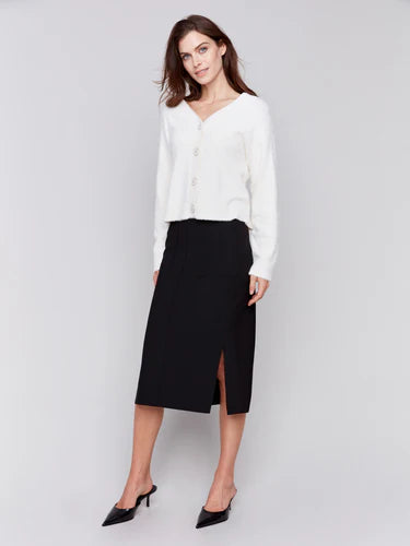 Get ready to strut your stuff in the Charlie B Gutsy Crepe Skirt! This midi length skirt is made from super stretchy fabric for ultimate comfort and features side slits for added mobility. The front patch pockets add a touch of functionality and style. Show off your bold and playful side in this skirt!
