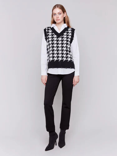 Be the talk of the town in the Charlie B Houndstooth Fooler Vest with Shirt Collar. This vest features a playful layered shirt look with a poplin collar, hem, and sleeves. Add some edge with the distressed hem and rock this quirky V-neck with long sleeves. (Don't miss out on being the coolest kid on the block!)