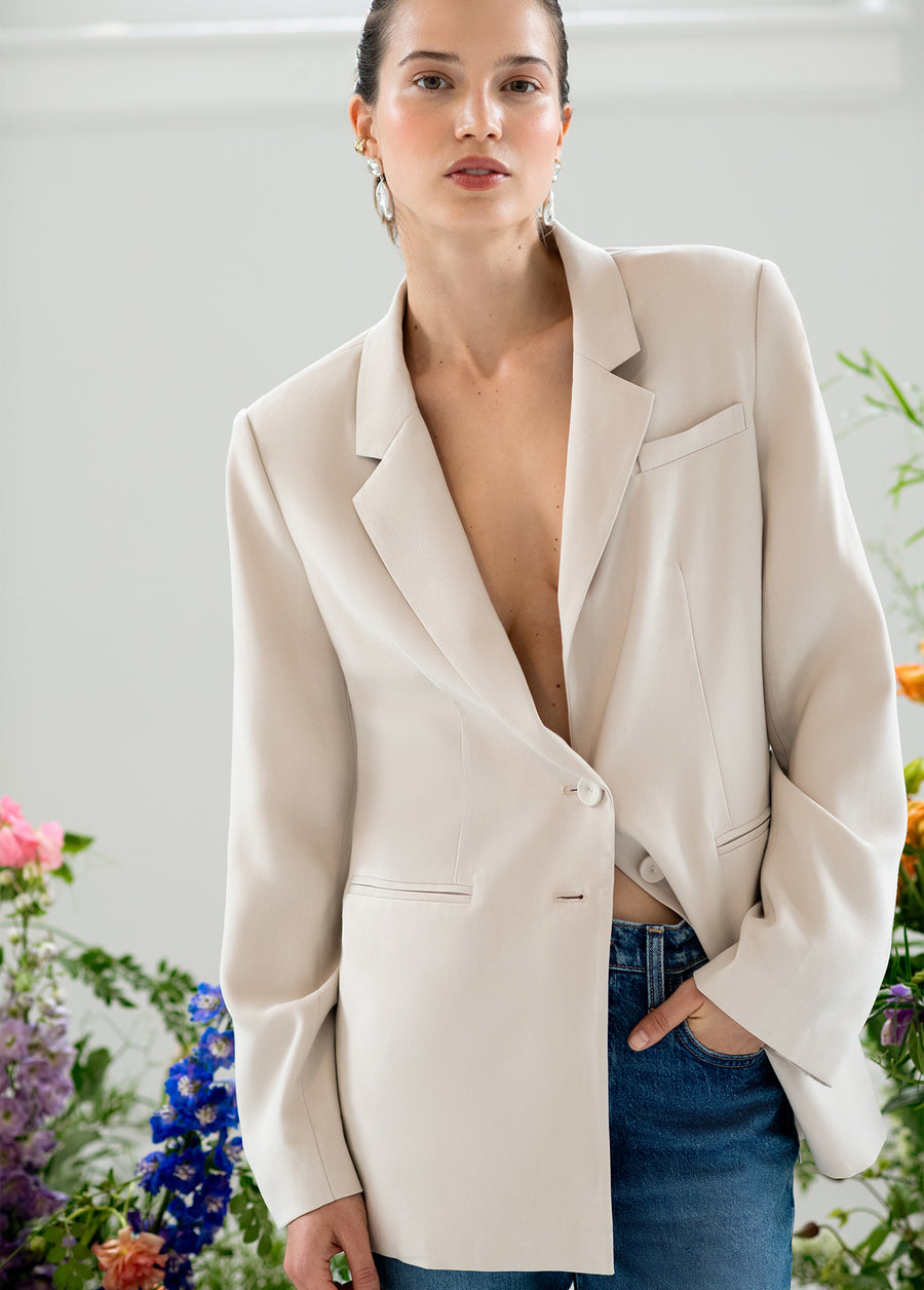 Take your style to the next level with our oversized fit Favorite Daughter The Alexis Blazer. Made with luxurious 93% Rayon and 7% Elastane, this blazer features an extended tailored slit in the back for a unique flair. Elevate any outfit with this fun and fashionable ladies woven blazer.