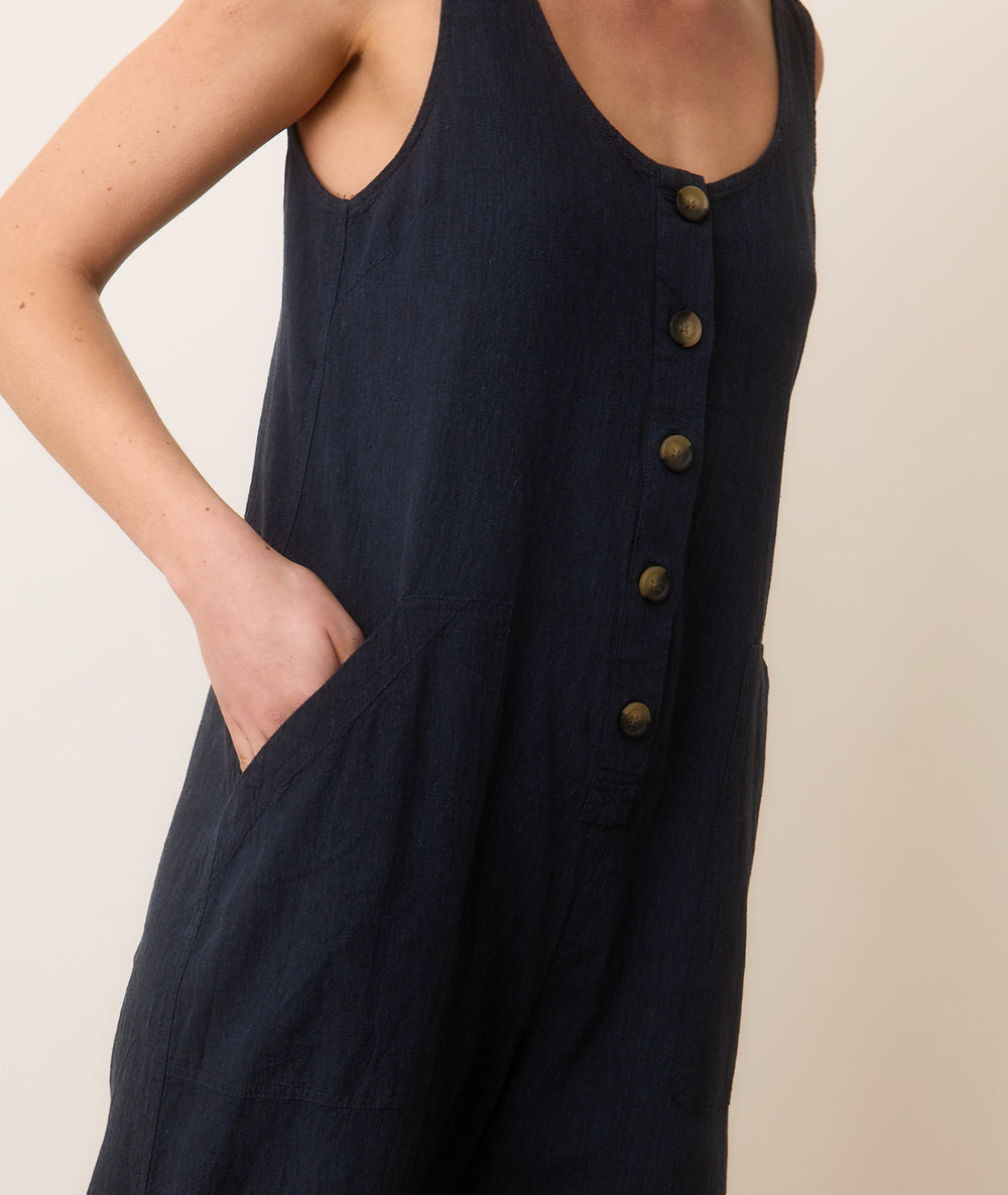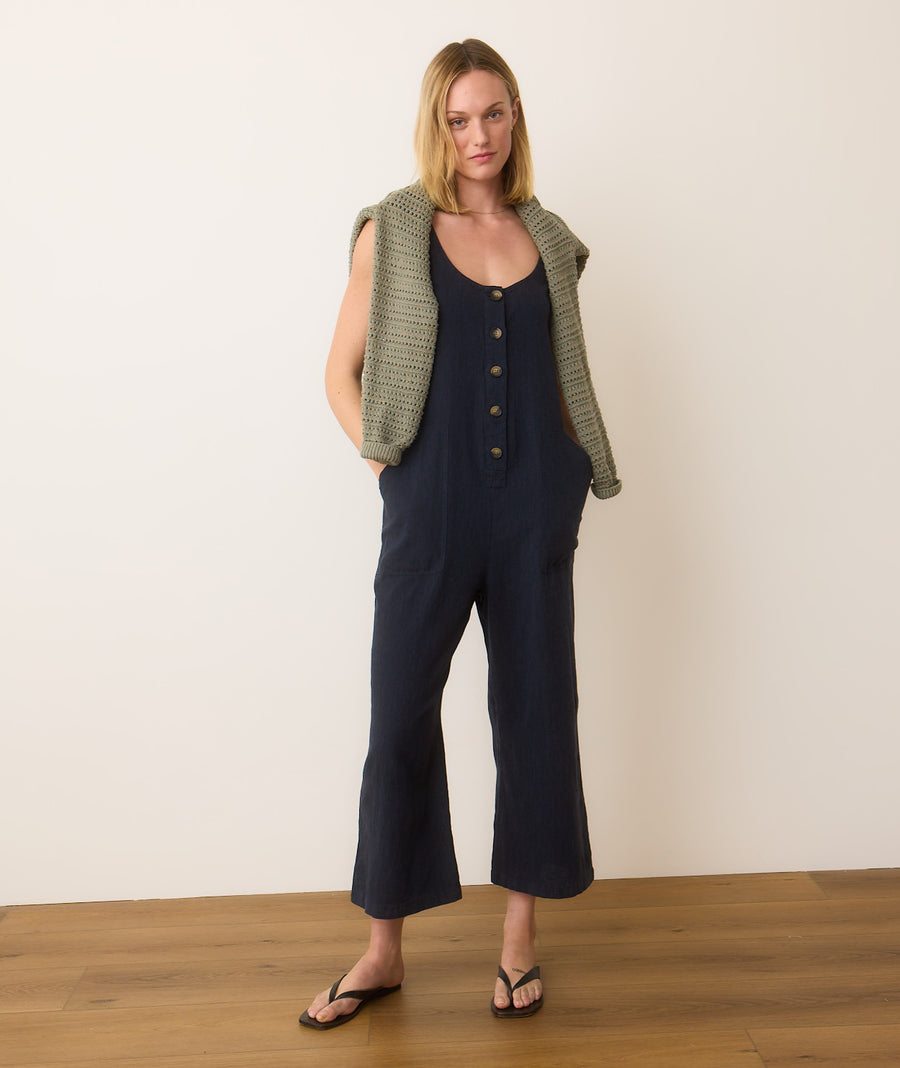Turn heads in the Marine Layer Sydney Jumpsuit. This sleeveless hemp jumpsuit offers all-day comfort with a touch of stretch. The button closure down the front and double scoop neck design add a stylish touch, while the cropped length keeps things cool and breezy. Perfect for any occasion, this jumpsuit is a must-have for your summer wardrobe.