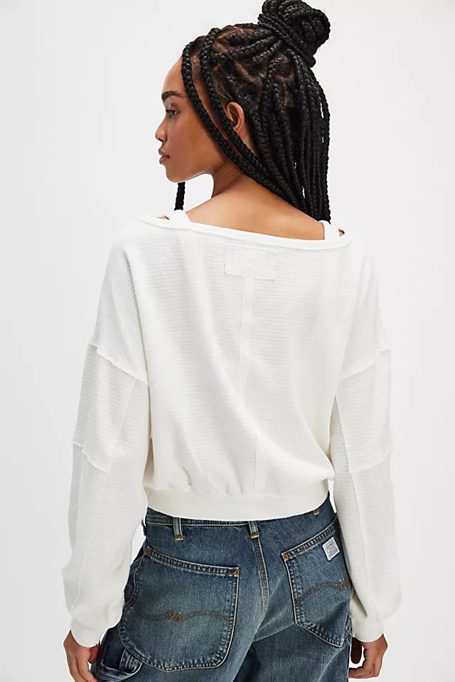 Get cozy and stylish in the Free People IFE Pullover. This relaxed fit, slightly cropped sweater is made of soft cotton thermal that will keep you warm while the wide scoop-neckline and dropped dolman sleeves add a touch of fun. The exposed seams and banded hem add a unique touch to this must-have piece.