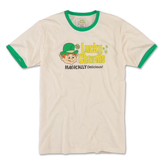 This vintage-inspired tee is crafted from 100% cotton and features a contrast ribbed ringer on the neck and sleeves. The lucky charms screen print adds a touch of nostalgia to this comfortable crew neck. Perfect for adding a playful touch to any wardrobe.