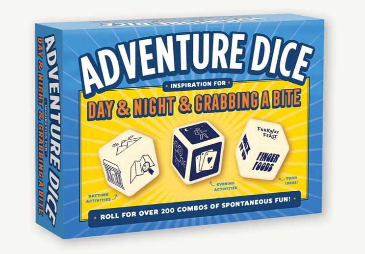 Auf der Suche nach ein paar Stunden spontanem Spaß oder einem ganzen Tag voller Abenteuer? Lassen Sie diese Würfel das Sagen haben! Der Schlüssel zu einem aufregenden Tag liegt in Ihren Händen. Lassen Sie einfach die Würfel rollen, um eine Tagesaktivität, einen Abendausflug und etwas Inspiration für das Essen zu finden.