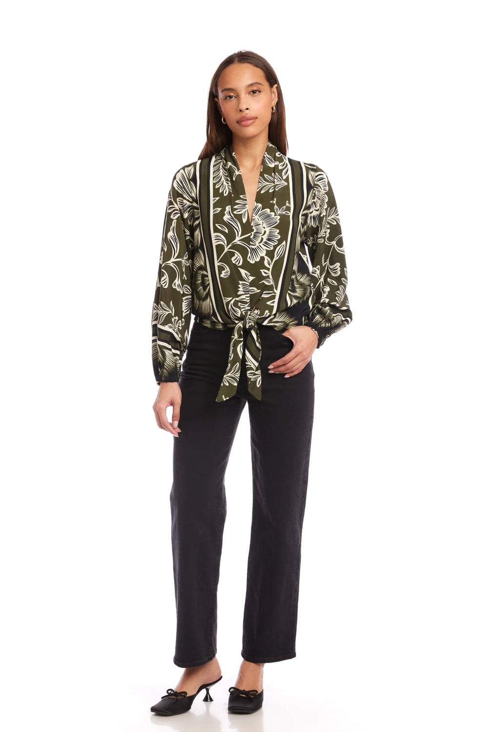 Elevate your wardrobe with the Fifteen Twenty Scarlet Tie Front Top in an elegant olive shade. Its delicate floral border crepe pattern adds subtle charm, while the long sleeves with elasticized cuffs offer comfortable wear. The adjustable front tie at the waist creates a flattering silhouette, complemented by a chic V-neck and relaxed fit for effortless style and comfort throughout your day.