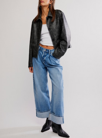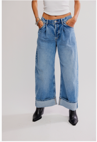 These Free People Alia Wide Leg Jeans bring a fun twist to classic denim. With a mid-rise fit and wide-leg silhouette, they offer a breezy, comfortable vibe. Crafted from authentic rigid denim, they feature a button fly, five-pocket styling, and playful pleating at the top for extra shape. The back button tab and tacked cuffs add charming details—feel free to unleash your creativity by uncuffing them with a seam ripper or scissors for a fresh look! Perfect for adding a little flair to your denim collection.