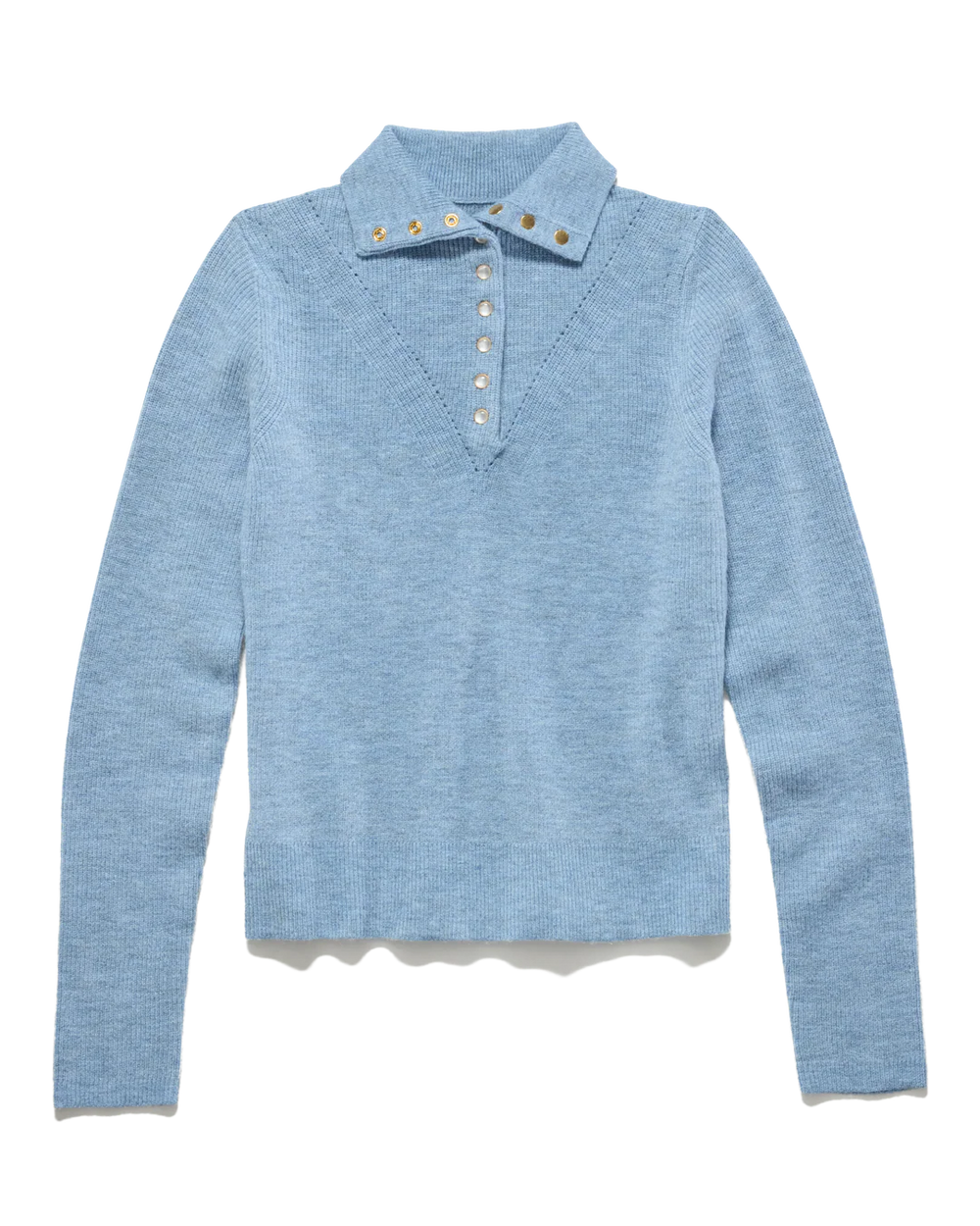 Elevate your wardrobe with the Flag & Anthem Castleberry Mock Neck Sweater, featuring an exaggerated mock neckline highlighted by stylish gold-tone pearl snaps for a touch of sophistication. Crafted from soft, cozy knit fabric with a subtle heathered texture, this sweater offers both comfort and effortless style. Its relaxed fit includes long drop shoulder sleeves and directional ribbed detailing on the front yoke, while contrasting ribbed accents on the neckline, cuffs, and hem add refined finishing touches. Ideal for those seeking a chic, versatile staple for any occasion.