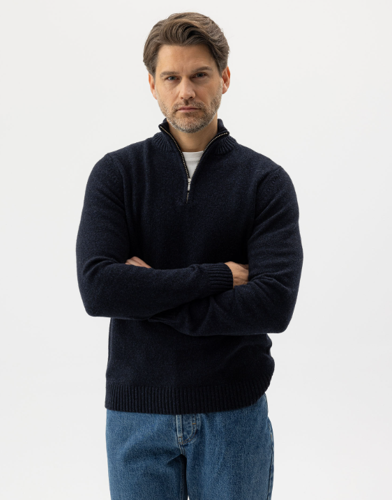 The Holebrook Charles T-Neck is a refined wool blend sweater crafted for lasting warmth and comfort. Featuring a sleek metal half-zip and structured T-neck collar, it easily transitions from casual to smart-casual looks. Ribbed cuffs and hem ensure a neat, regular fit, while the OEKO-TEX® certified yarn and European sustainable production highlight its responsible quality. Elevate your wardrobe with this timeless, versatile knitwear essential.