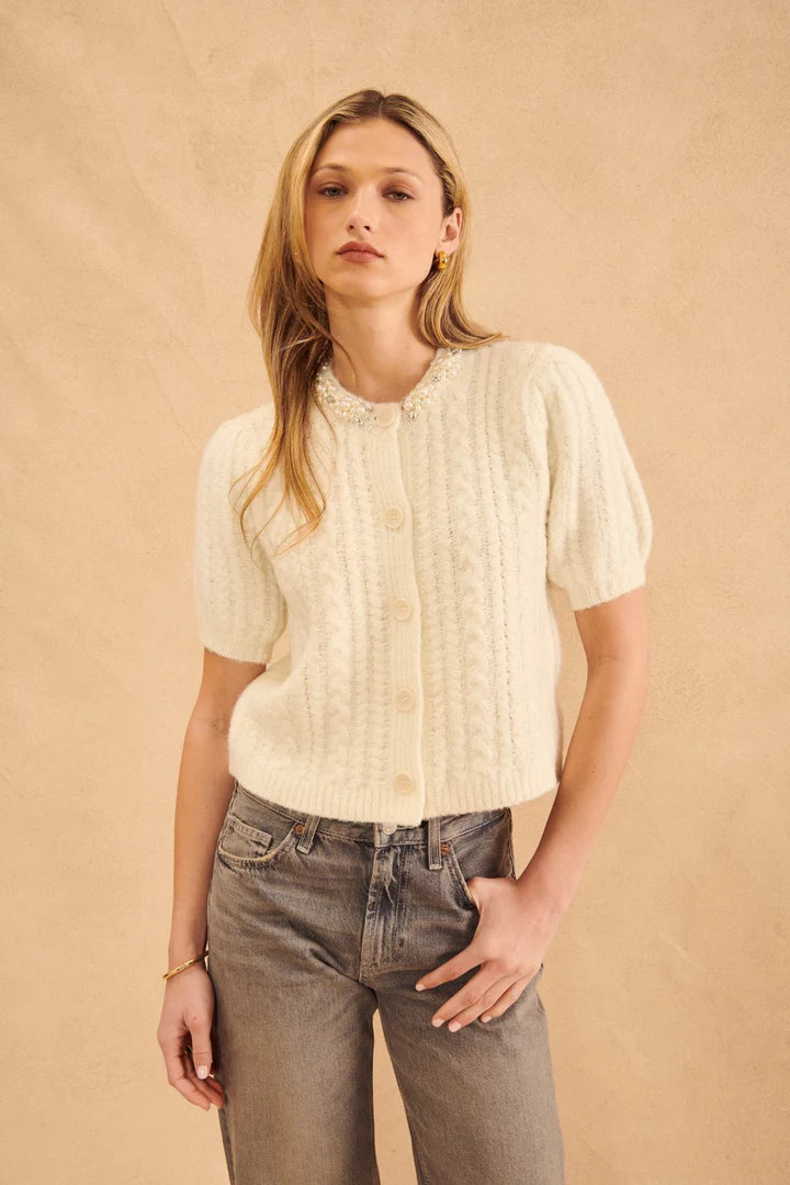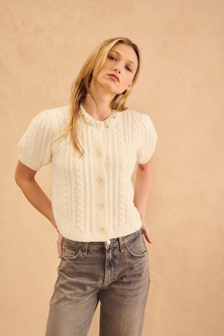 Unleash your inner fashionista with the John & Jenn Maxwell Sweater. This playful short sleeved cardigan features a stunning jeweled neckline, adding a touch of glamour to your everyday look. Stay warm and stylish with this unique and quirky addition to your wardrobe.