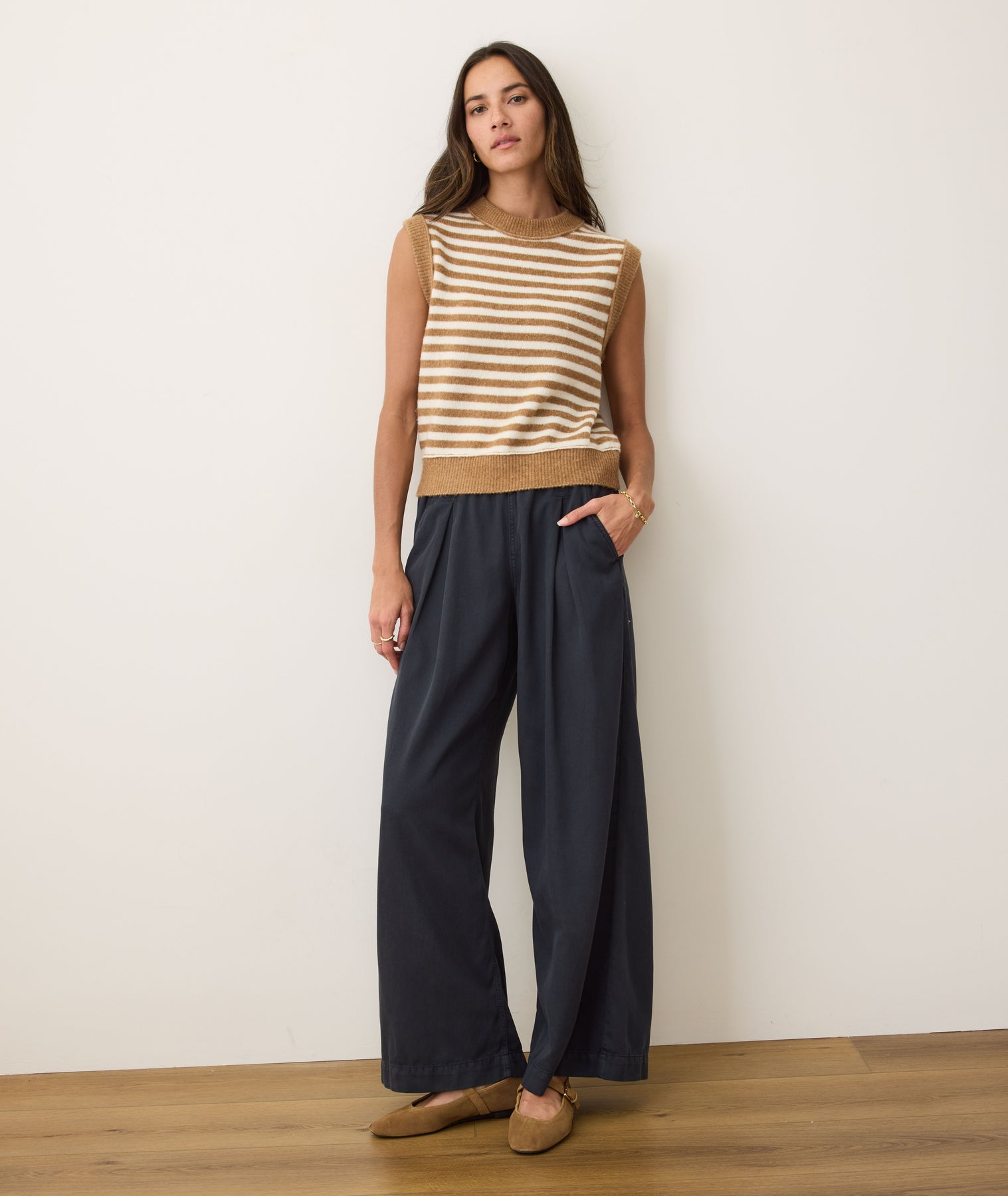 The Marine Layer Sausalito Sweater Vest adds a fun twist to your wardrobe with its contrasting waistband, neck collar, and arm details. This playful design brightens up any outfit, giving you a stylish edge while keeping it cozy and comfortable for all-day wear. Perfect for layering or standing out on its own!