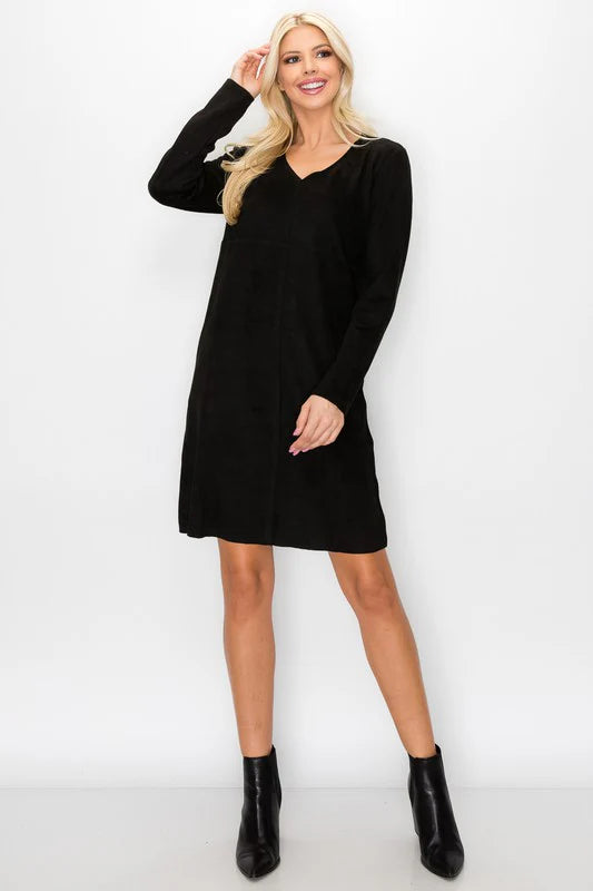 Experience luxury and sophistication with our Joh Aurora Suede V-Neck Dress. Made with high-quality suede, this dress features a versatile design that can be worn as a dress or tunic. Its easy relax fit, long sleeves, and super soft fabric make it comfortable to wear. Elevate your wardrobe with our best-selling, timeless, and classic style.