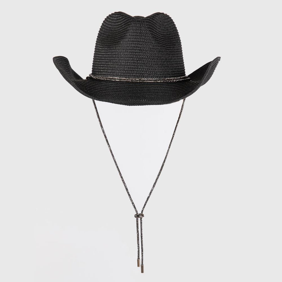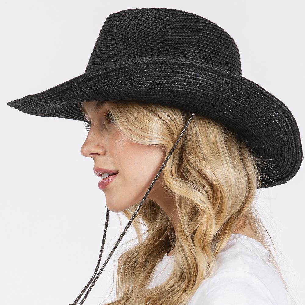 Upgrade your western style with our Joia Rhinestone Chin Strap and Band Cowboy Hat! This unique hat features a rhinestone chin strap and band for an extra touch of glamour. Stand out from the crowd with this stylish and eye-catching accessory.