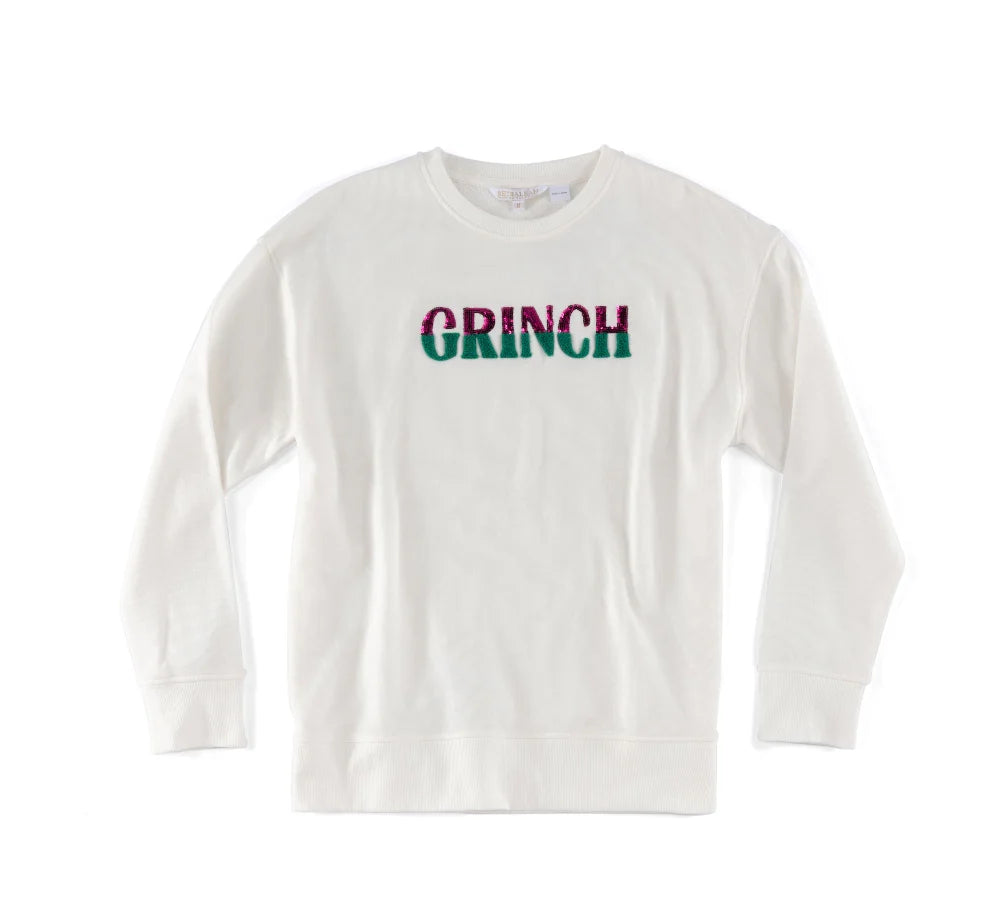 Get cozy this holiday season with the Shiraleah Grinch Sweatshirt! Made of lightweight cotton blend, this ivory sweatshirt is perfect for working from home or lounging on Sundays. The playful "Grinch" design features bold sherpa and sequin lettering for a touch of fun. With a classic fit and comfortable details like a round neck and banded cuffs, this sweatshirt is the ultimate in comfort and style.